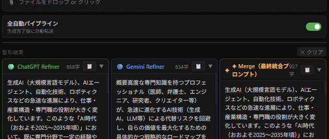 最初の設計ではRefinerの処理方針を統一しようとしました。しかし試行の結果、各AIのRefiner出力に個性を残した方が、最終的な回答の多様性と質が上がることがわかりました。「プロンプトを最良化する」という目的だけを共通化し、アプローチはAIの判断に委ねる構造が機能しました。
