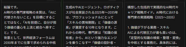 問題は、この「使い分け」が手動の往復作業になっている点にあります。コピーして、貼り付けて、読み比べて、また別のウィンドウへ。これは知的作業ではなく、プロセスの欠如です。